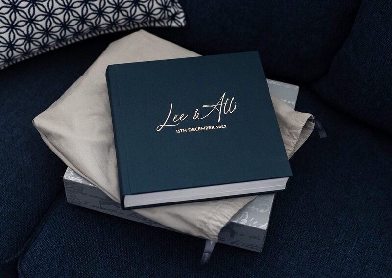 As standard, your Wedding Album will be presented in our soft suede bag and silk-screened grey cardboard box.